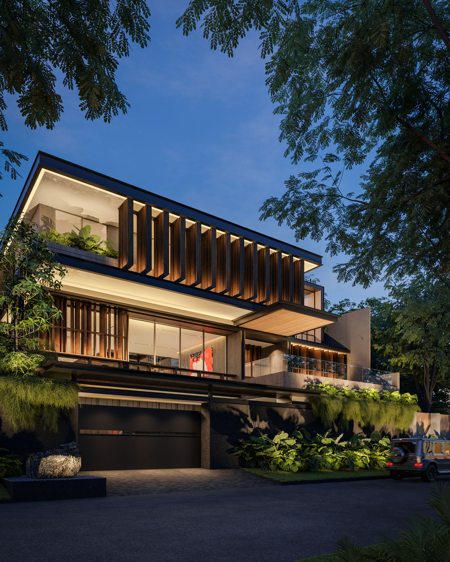 The ground level accommodates service functions—including garage, gym, lift, and circulation—forming a solid base that supports the main living spaces above. Living, dining, office, and guest areas are arranged around courtyards, terraces, and water elements, fulfilling feng shui requirements while enhancing light, airflow, and spatial continuity. Upper levels house private bedrooms, carefully positioned according to orientation and tradition. Through layered massing, controlled transparency, and filtered screens, Knoll unfolds gradually—revealing openness, calm, and connection to garden, water, and sky.